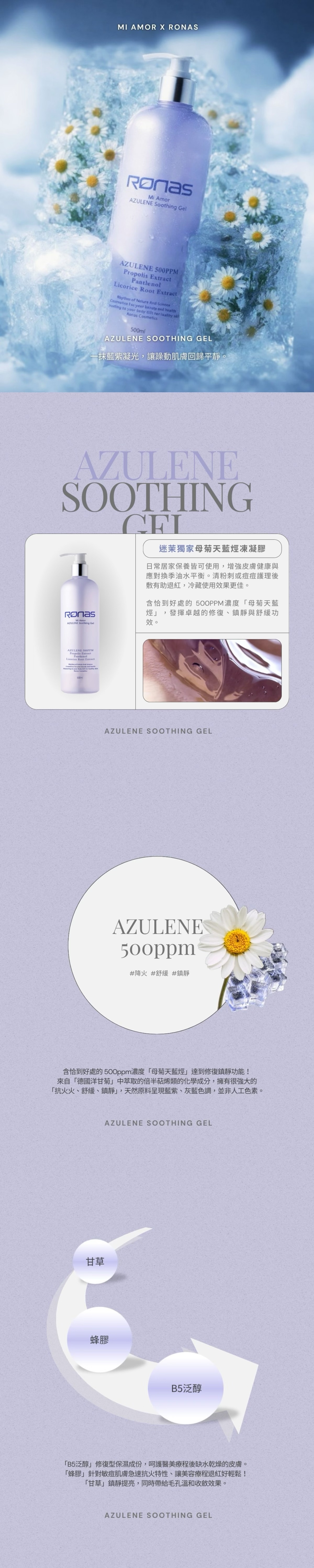 含500ppm濃度母菊天藍烴修復鎮靜、蜂膠抗火特性、甘草鎮靜提亮。